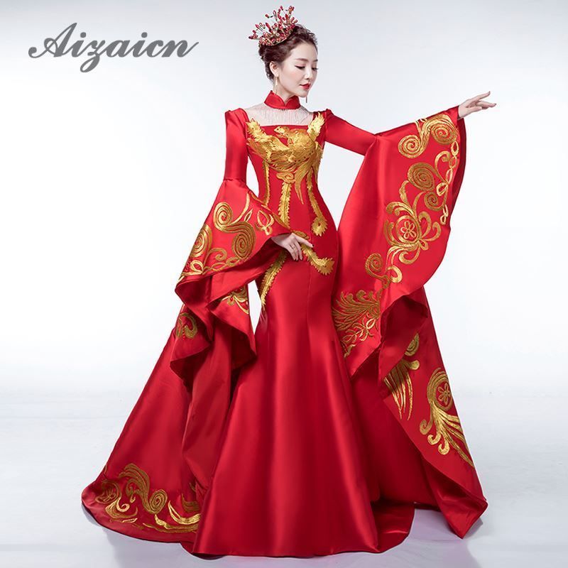 Luxury Red Tailing Evening Dress Elegant Fashion Show Embroidery Gold Phoenix Cheongsam Dresses Traditional Chinese Wedding Gown