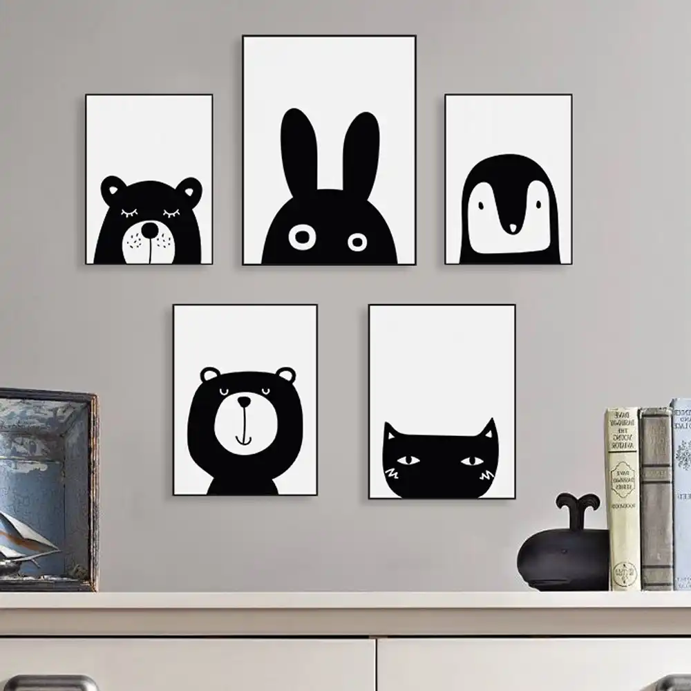 Hitam Putih Kawaii Hewan Beruang Kelinci Poster Cetakan Nordic Bayi Anak Anak Kamar Dinding Seni Gambar Dekorasi Rumah Lukisan Kanvas Tanpa Bingkai