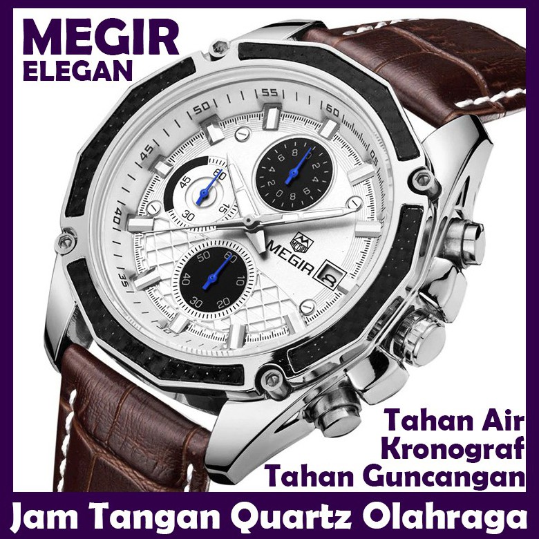 Elegan Bisnis Jam Tangan Megir Pria Jam Analog Quartz Multifungsi Kulit Chronograph Olahraga