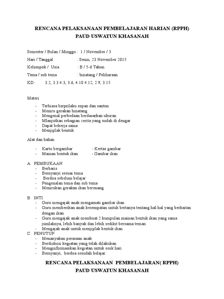 Rencana Pelaksanaan Pembelajaran Harian Rpph Kelompok B Semester